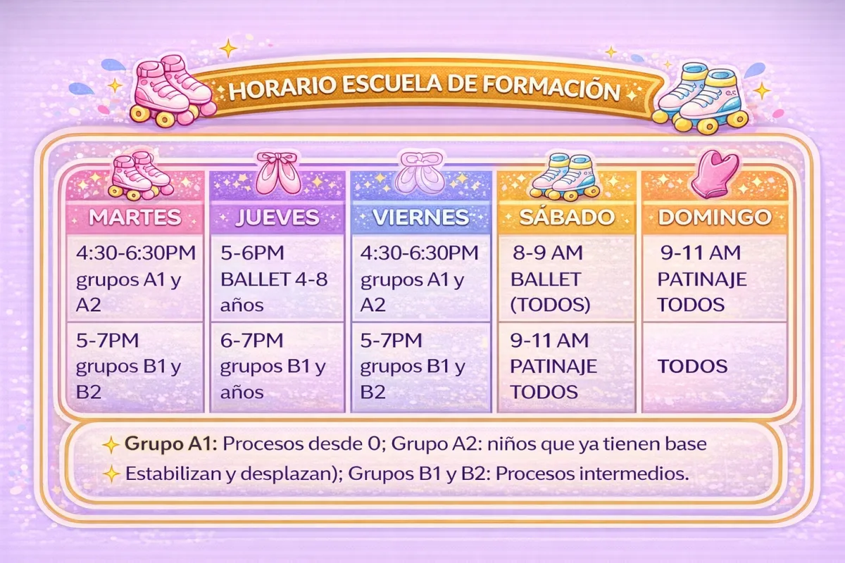 Además del patinaje, nuestros niños complementan su formación con clases de ballet, disciplina que aporta gracia, postura, flexibilidad, ritmo y un excelente sentido del cuerpo, indispensables para futuros patinadores artísticos.